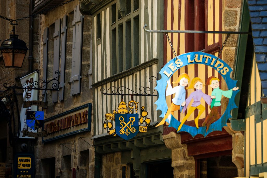 After entering the island through the medieval gate, visitors follow the Grande Rue, the main street leading toward the abbey. Historic houses, small shops, and stone walls line the path.